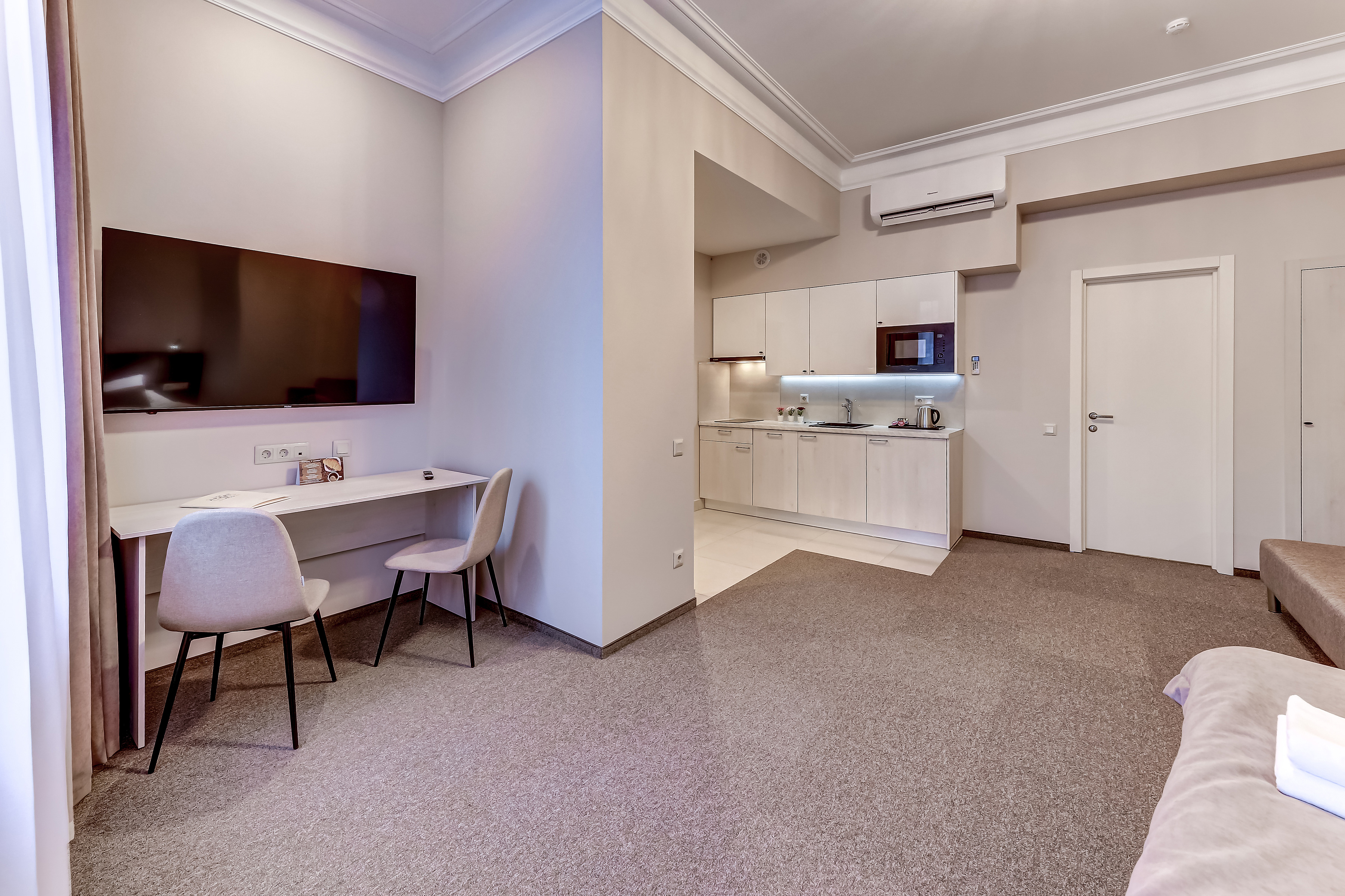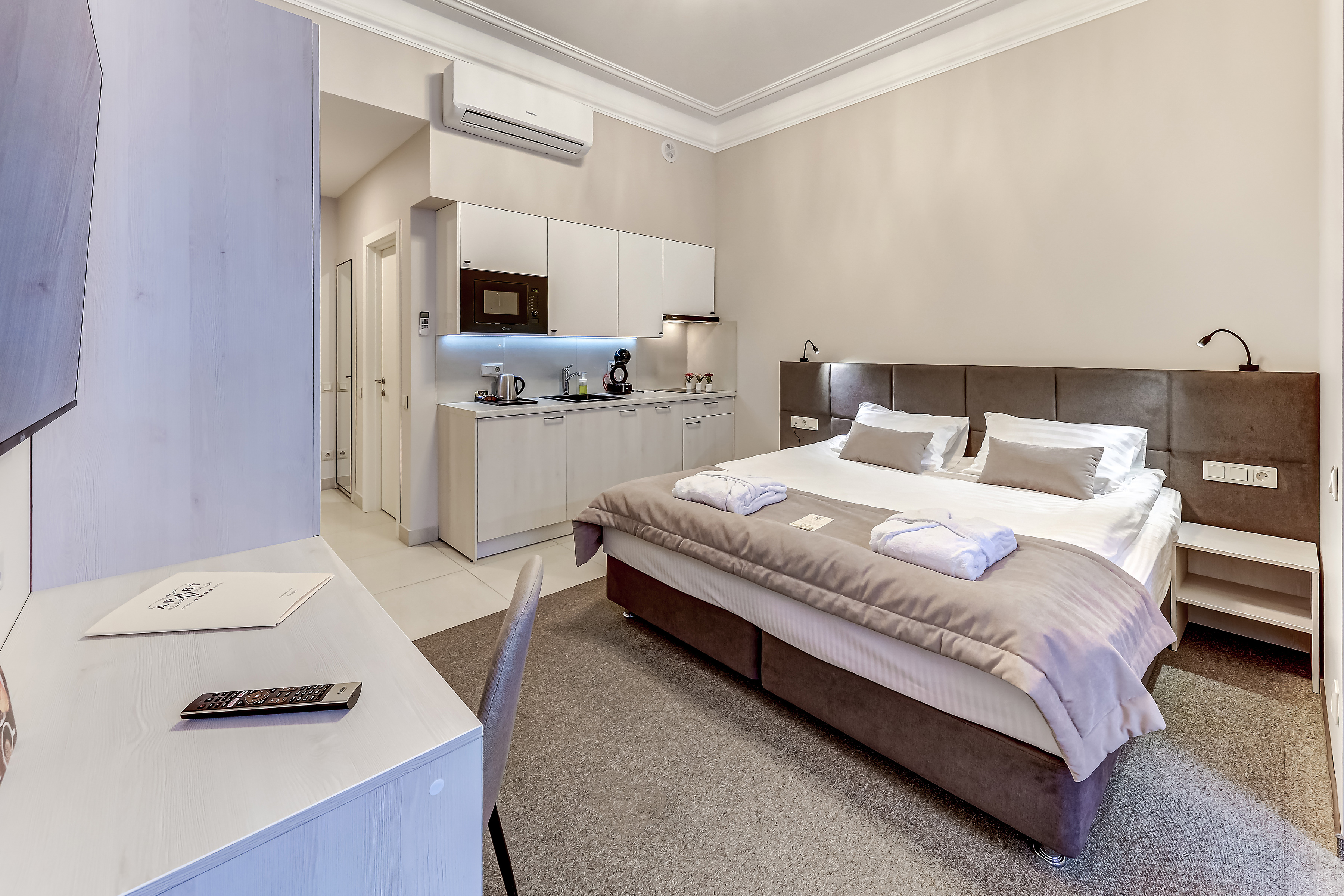 «V Аpart» Отель предлагает своим гостям размещение в V-ти стильных дизайнерских апартаментах : IV Студии и I номер категории ДеЛюкс. Все номера оформлены в едином стиле, в спокойных тонах, с элементами эклектики, дополняющими в интерьере дух Санкт-Петербурга. Все номера идеально подходят как для длительного проживания, так и для кратковременных туристических и деловых поездок. Номера всех категорий оснащены всем необходимым: кондиционерами; широкоформатным плазменным телевизорами с фуккцией Smart ТВ; кухнями с холодильником, микроволновой печью, варочной панелью, кофе машиной, чайником, посудой. Так же все номера имеют собственные ванные комнаты с теплыми полами, обустроенные комфортабельными ваннами, фенами, дополненные косметическими принадлежностями, халатами и тапочками. Наши гости всегда могут воспользоваться бесплатной парковкой, бесплатным высокоскоростным Wi Fi на все территории отеля, прачечной комнатой.